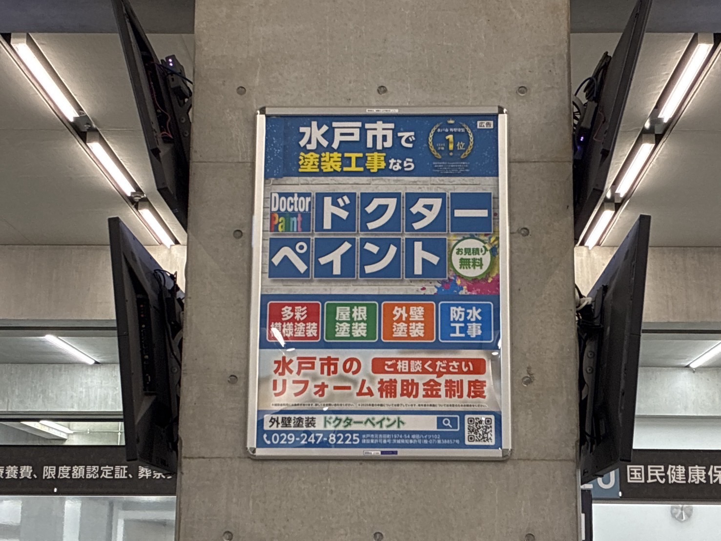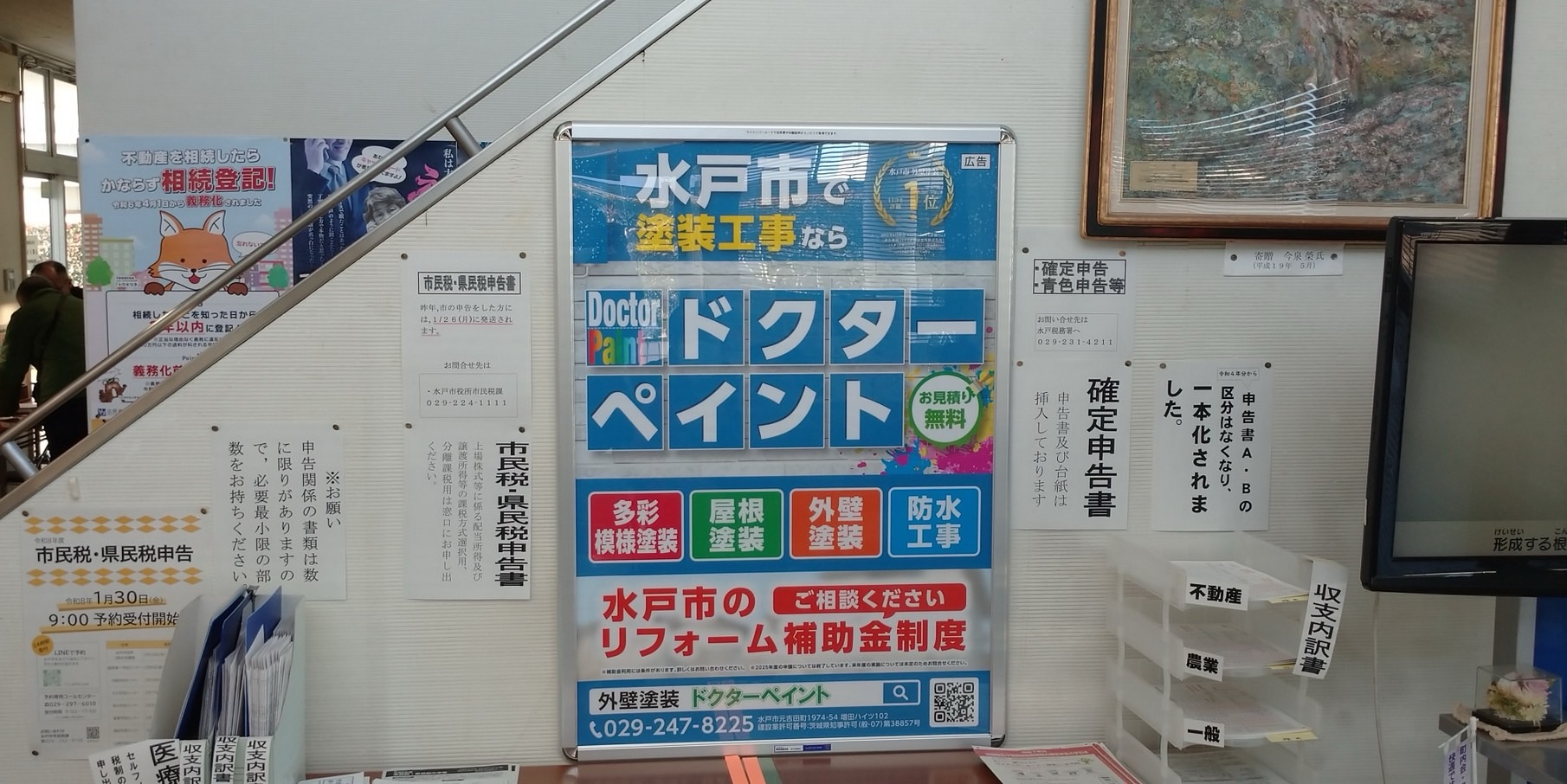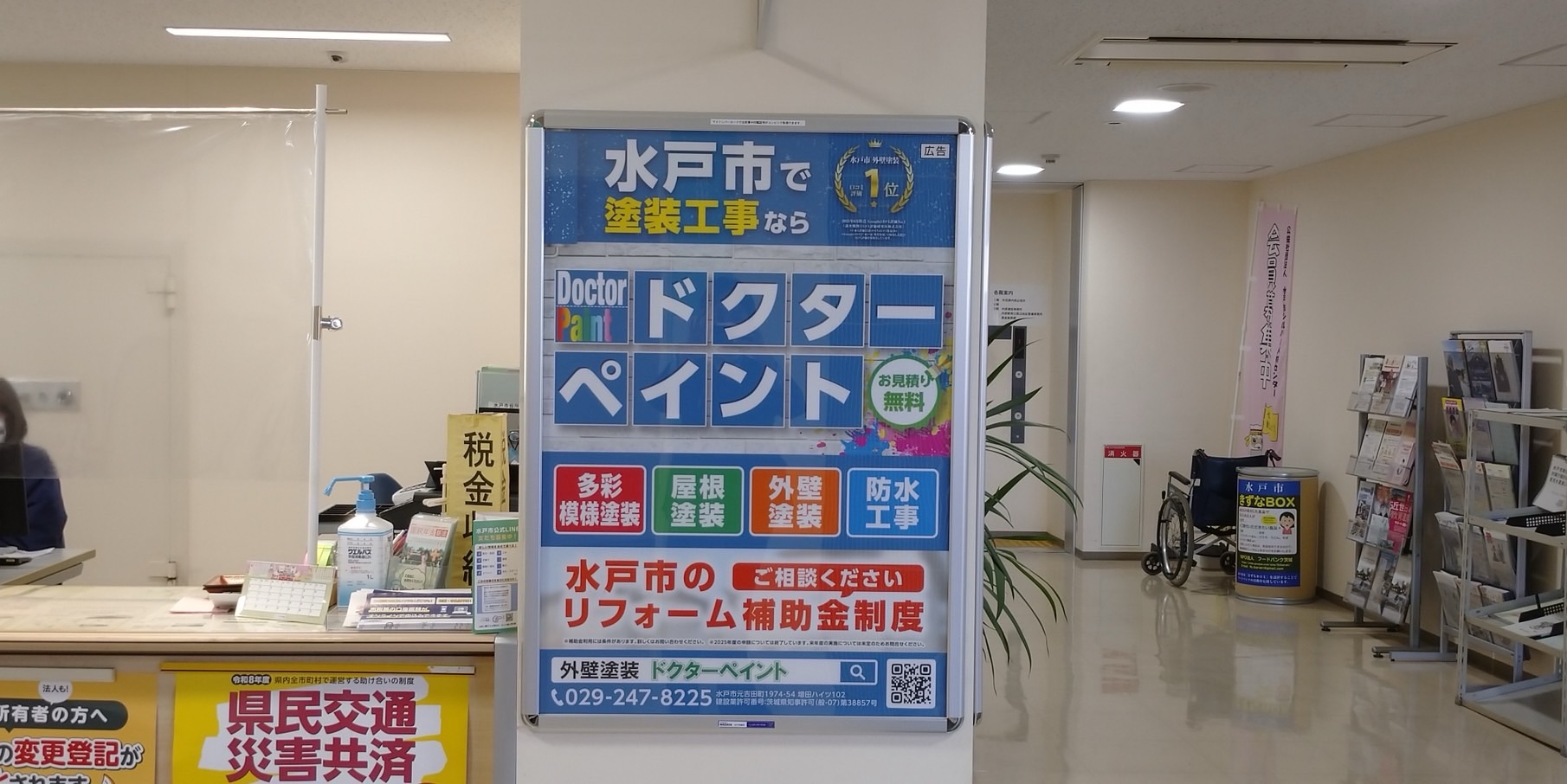水戸市役所に広告掲載中|地域に認められた塗装会社です 2026.3.28 Saturday ドクターペイントは、水戸市役所内にて広告掲載を行っております。厳しい掲載基準をクリアした企業のみが掲出できる公共施設広告だからこそ、地域の皆様に安心してご相談いただける証でもあります。 これからも水戸市密着の塗装専門店として、外壁塗装・屋根塗装・防水工事を通じて、皆様の大切なお住まいを守り続けてまいります。 « next prev »