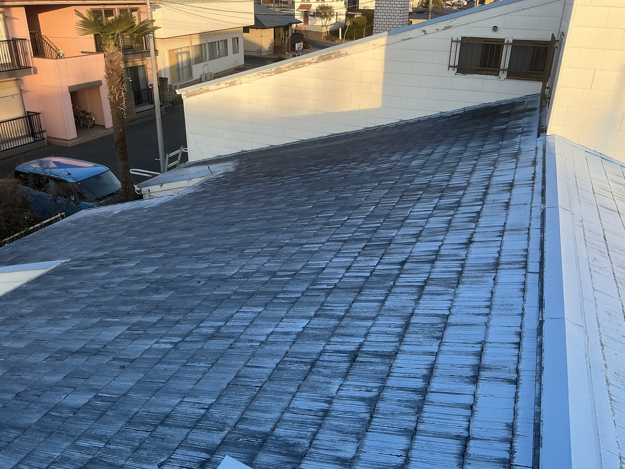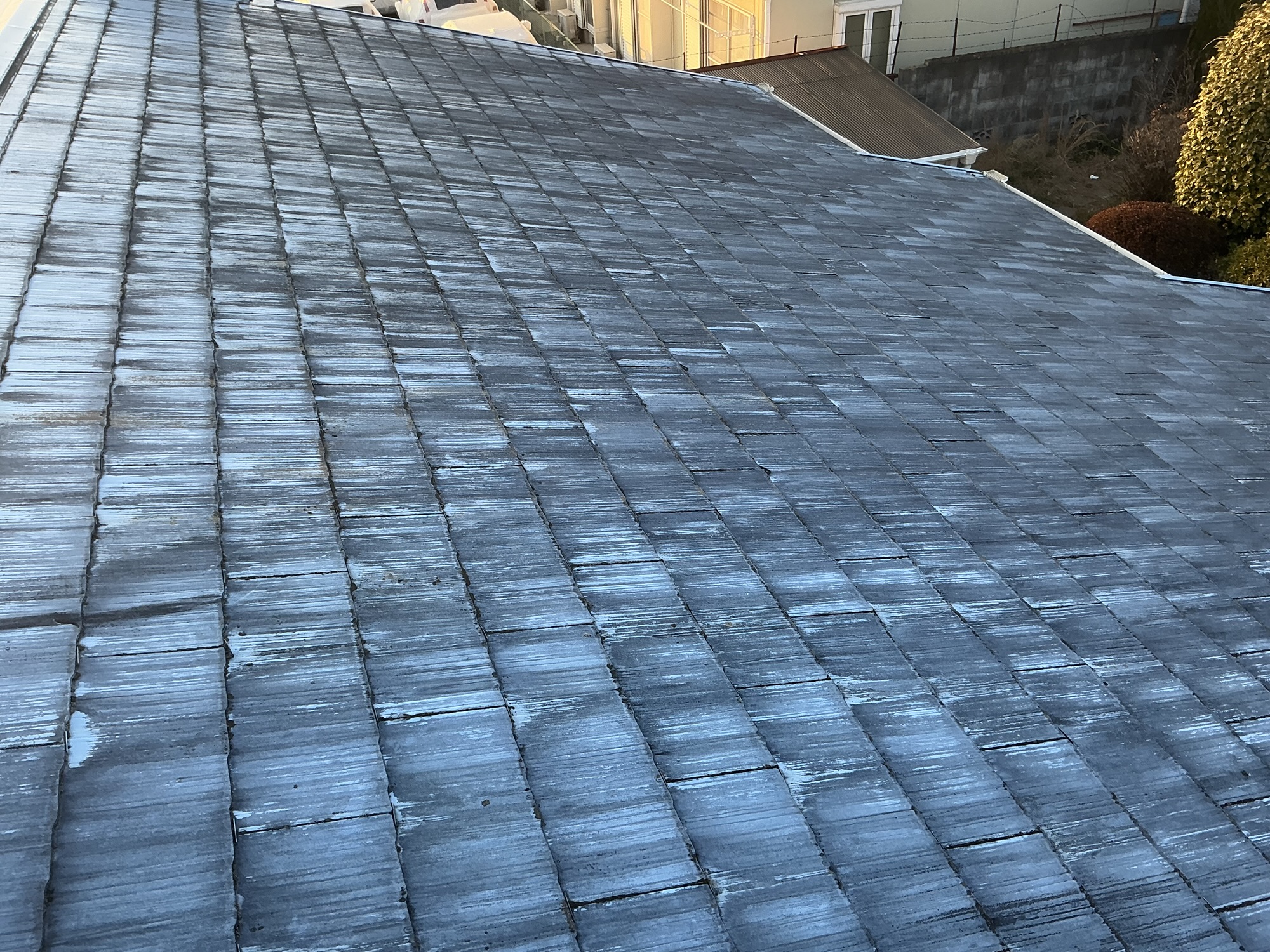 既存のスレート屋根は、長年の紫外線や雨風の影響により色あせや劣化が進み、防水性能の低下が見られる状態でした。