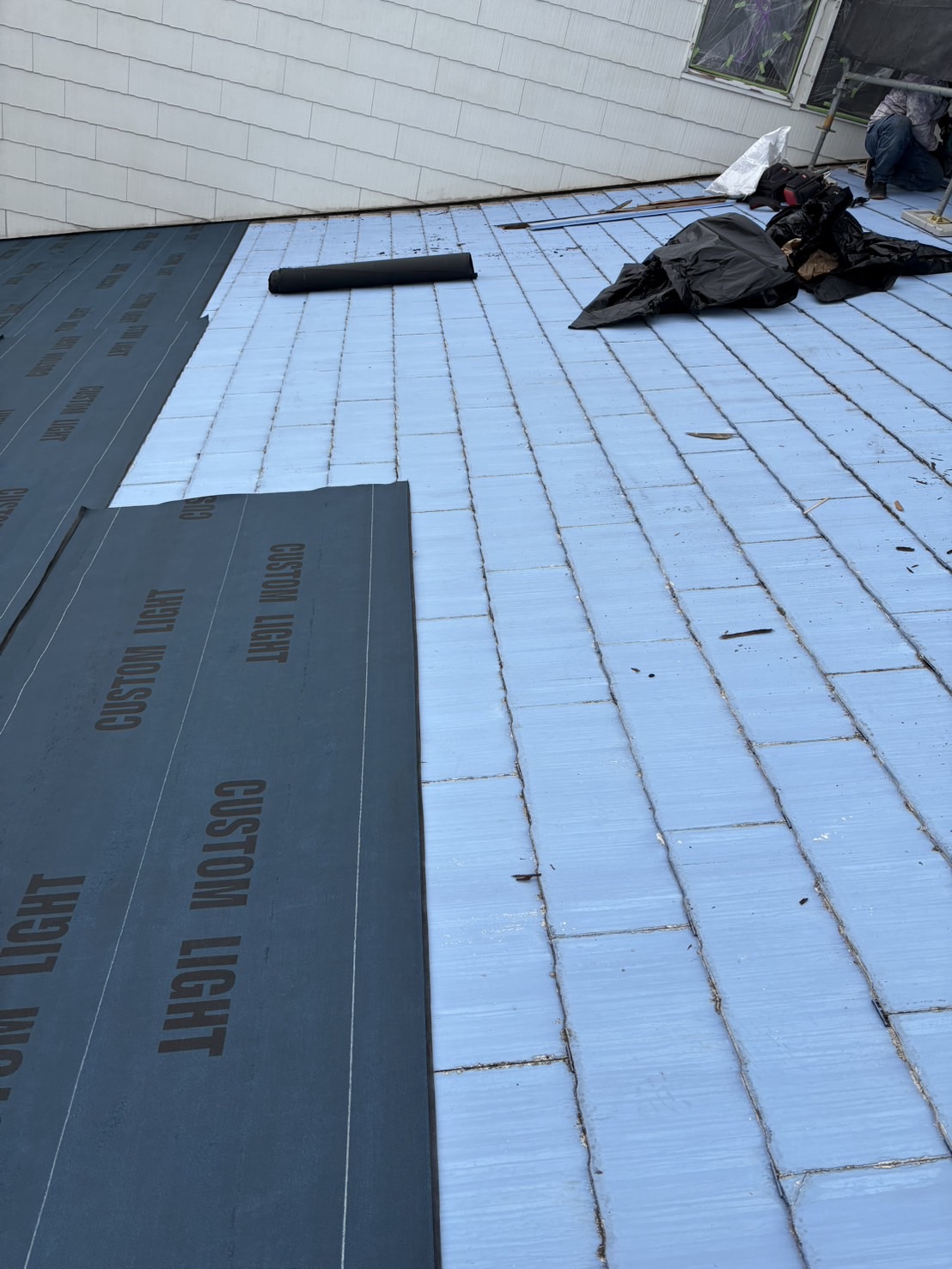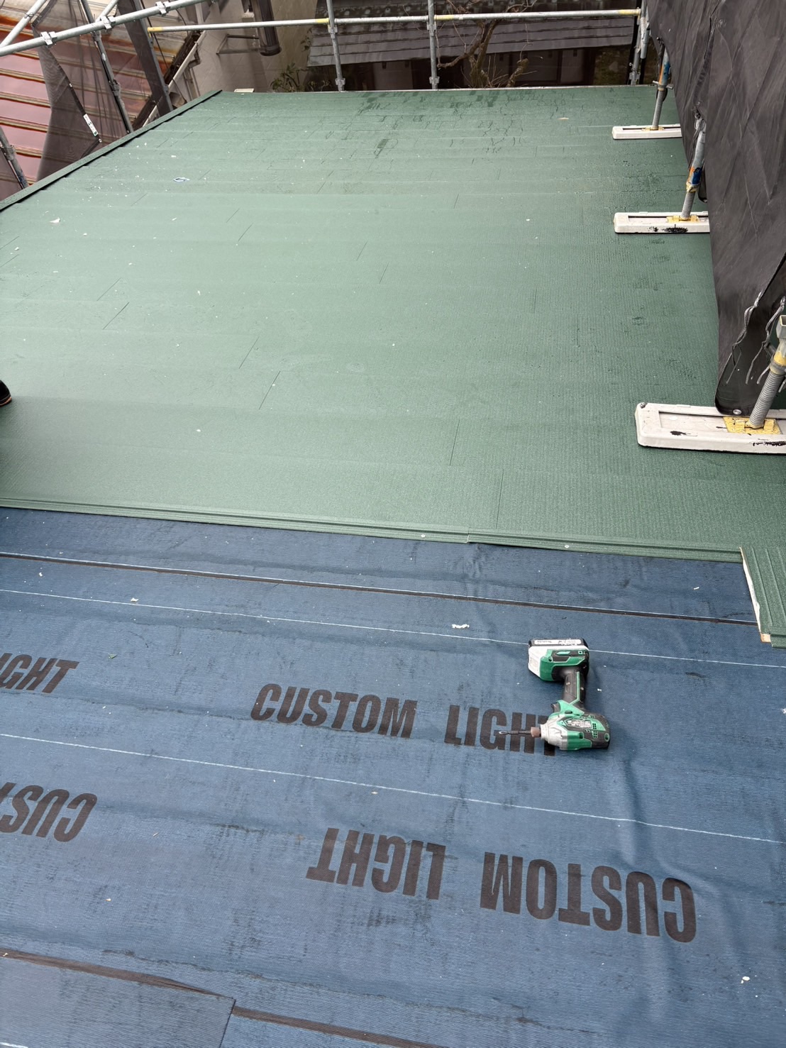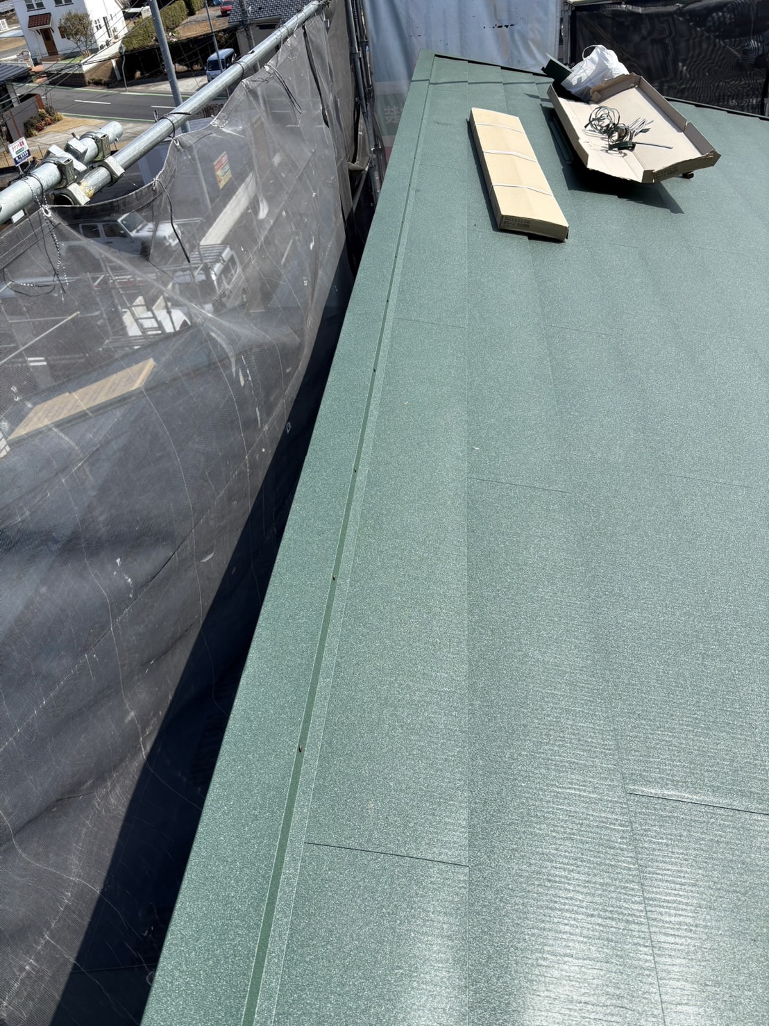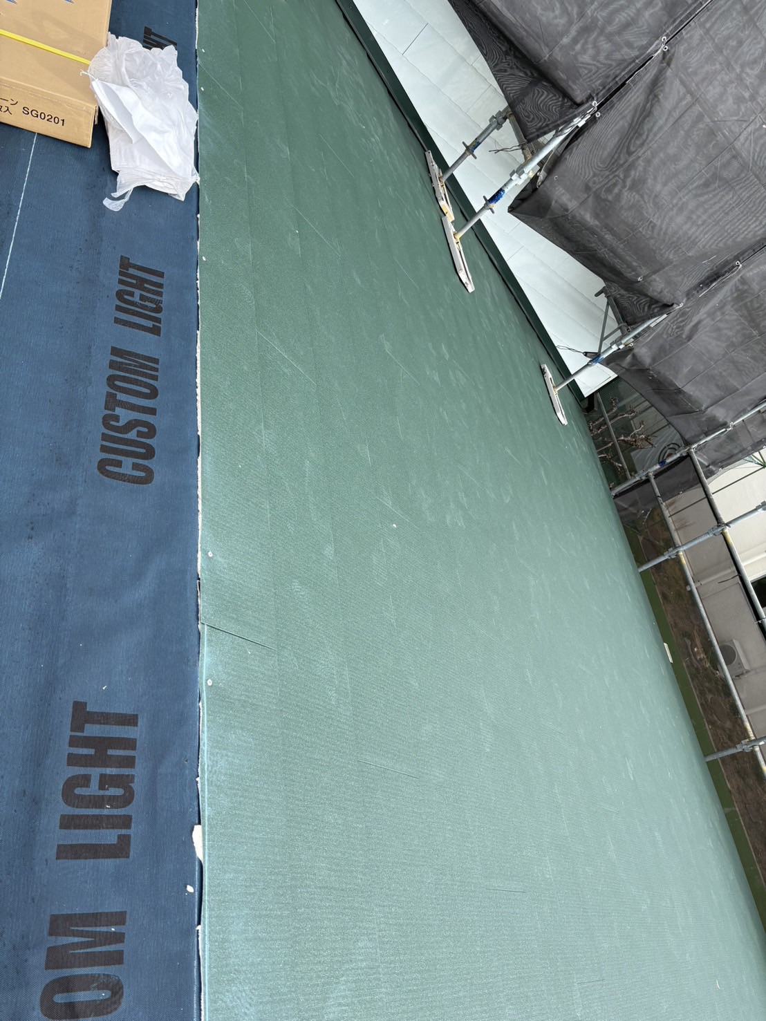 既存のスレート屋根の上に防水シート(ルーフィング)を施工し、その上からガルバリウム鋼板屋根を施工しました。