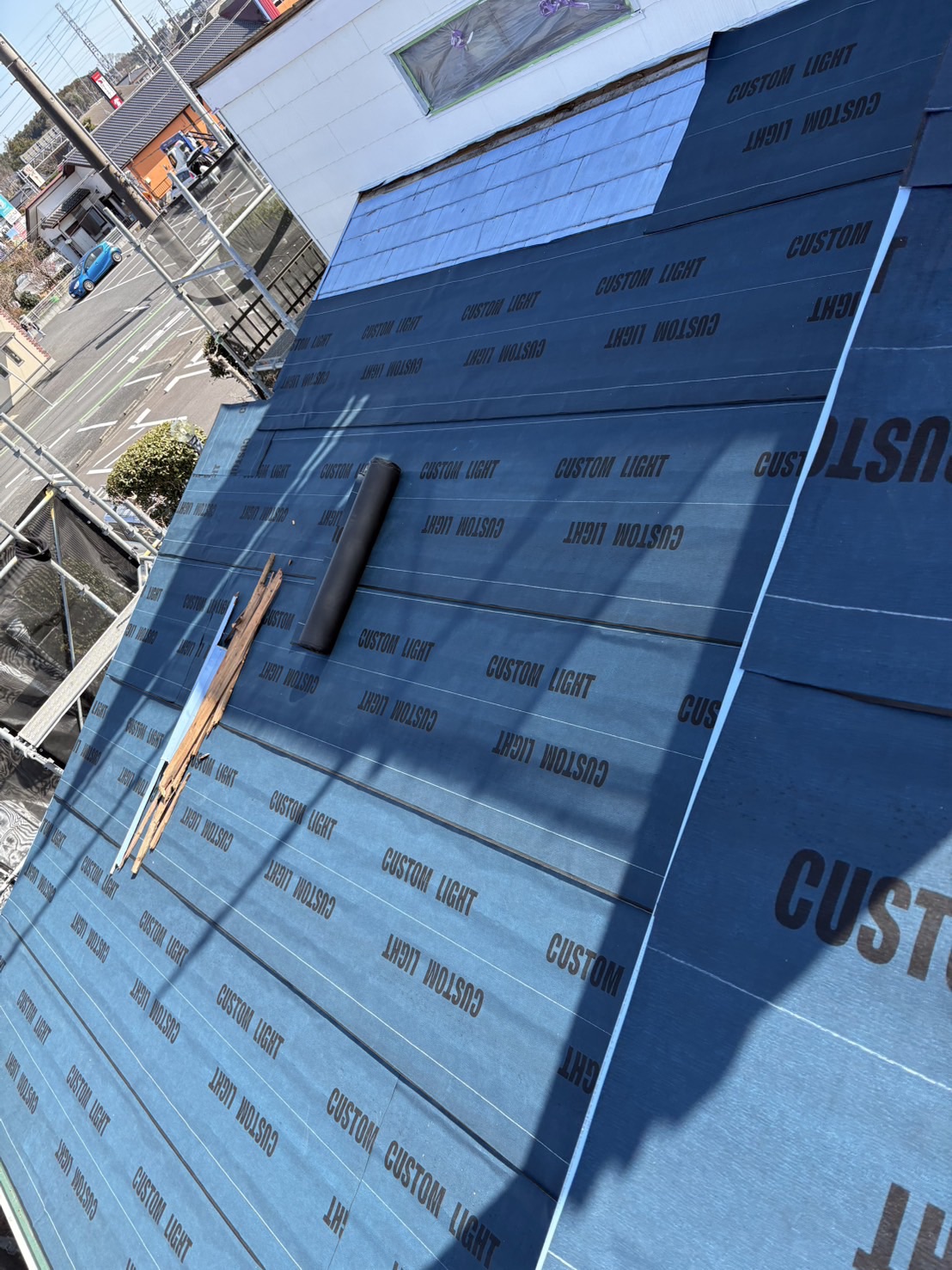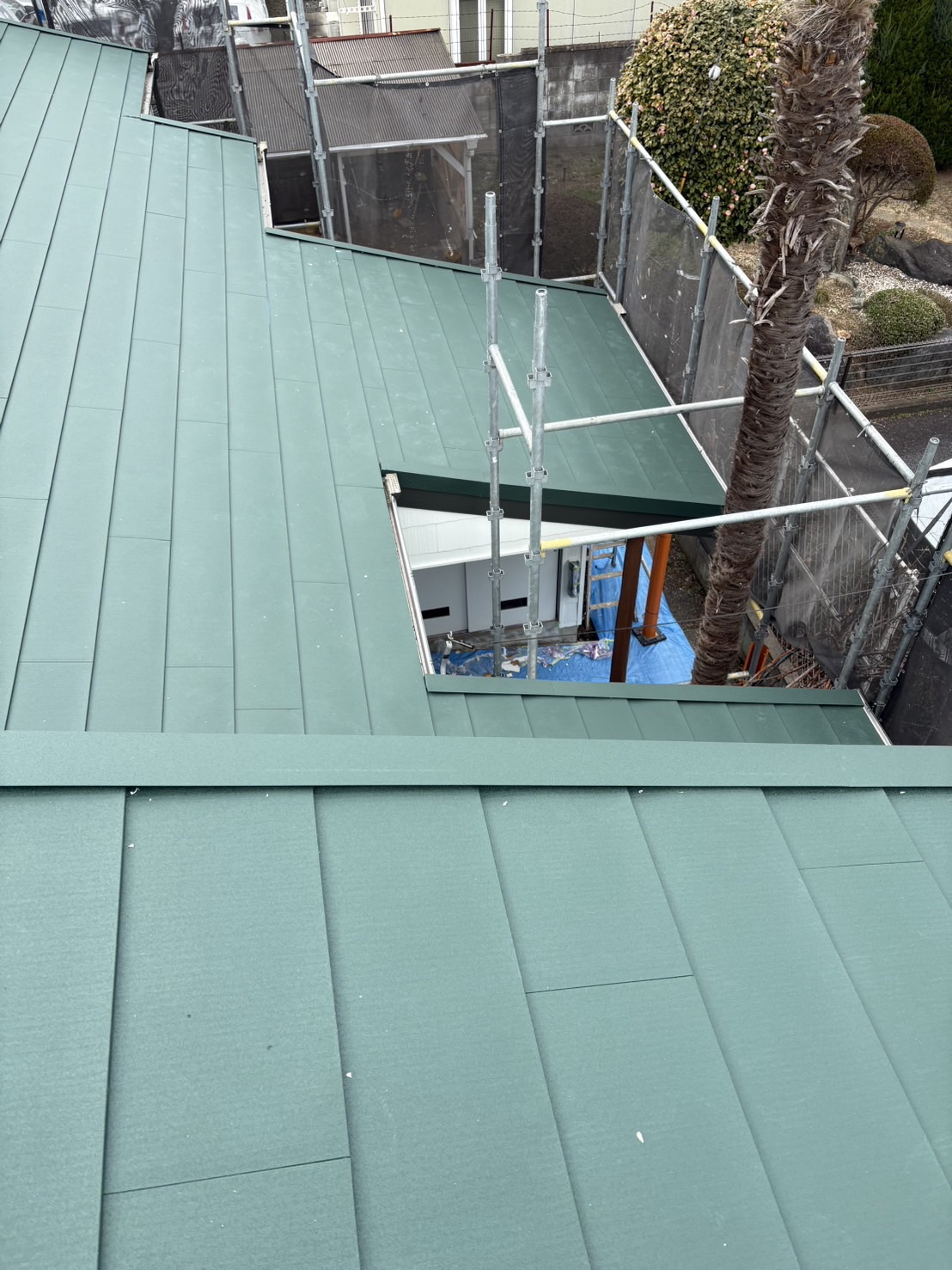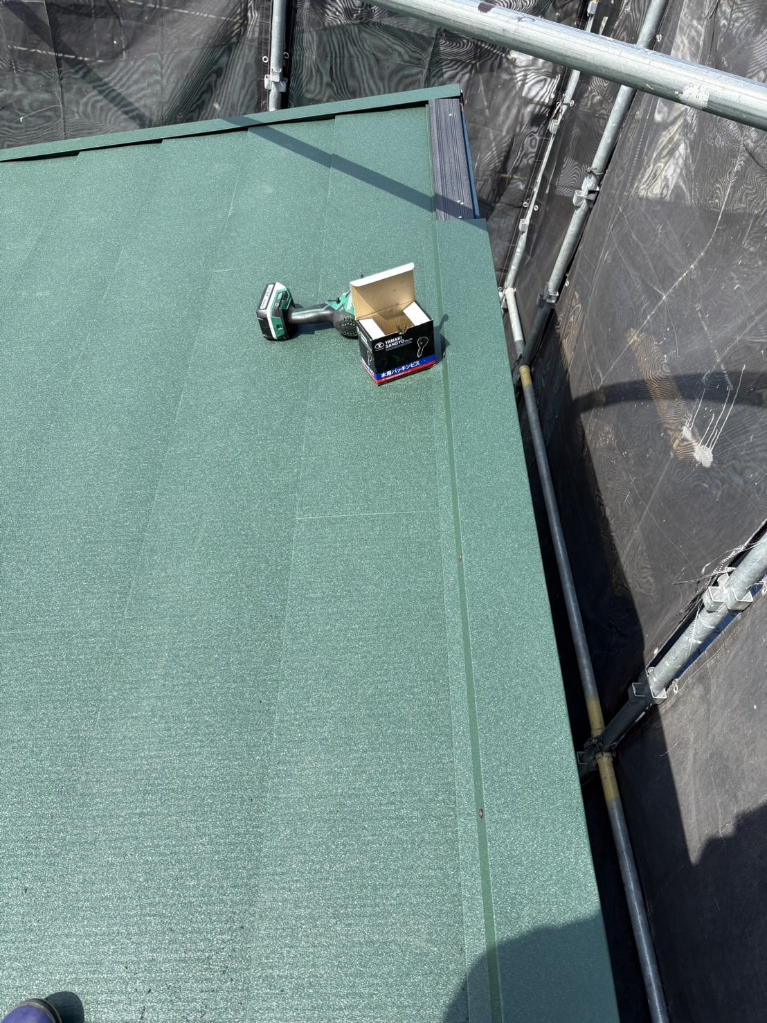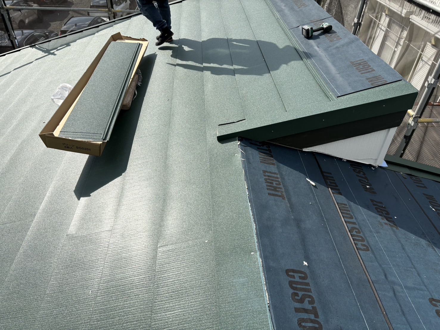 既存のスレート屋根の上に防水シート(ルーフィング)を施工し、その上からガルバリウム鋼板屋根を施工しました。