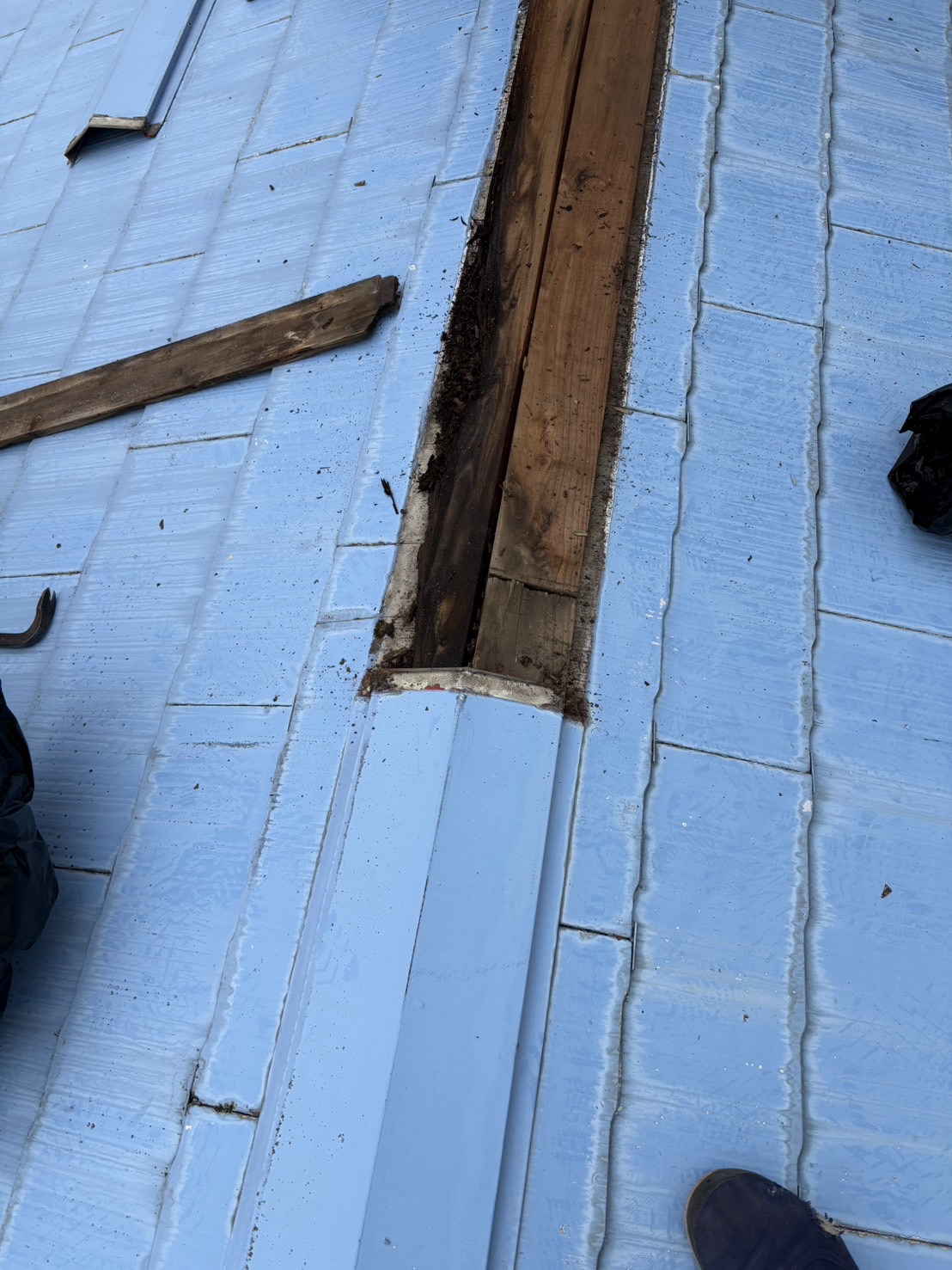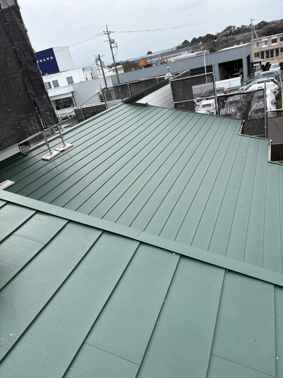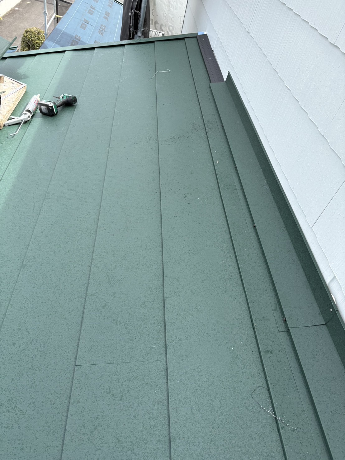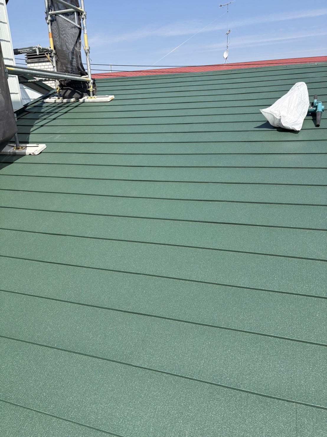 既存のスレート屋根の上に防水シート(ルーフィング)を施工し、その上からガルバリウム鋼板屋根を施工しました。